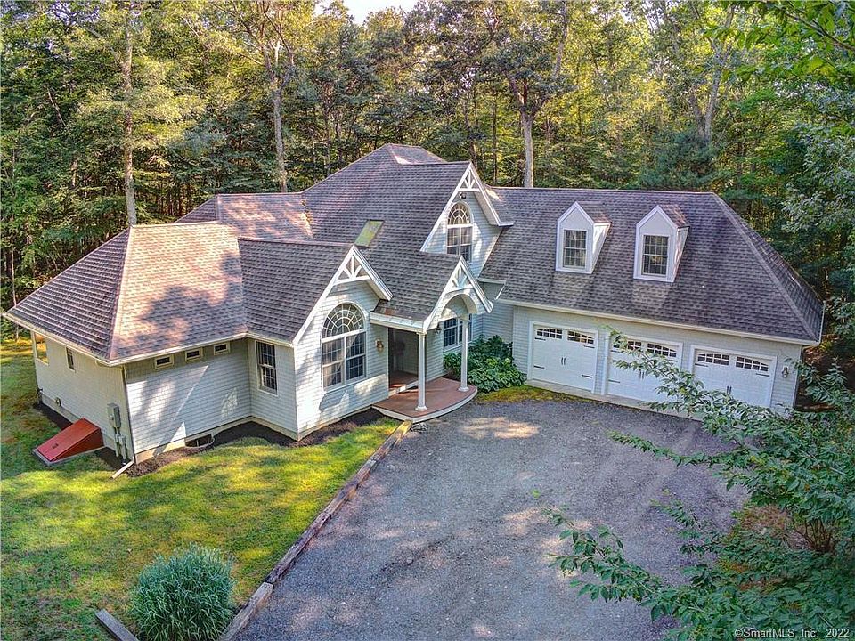 Welcome to 31 Wolf Neck Road in Stonington -- a unique three thousand sq. ft. Contemporary home providing a secluded location but minutes away from the Eastern Connecticut destinations of Mystic, the “Wine Trail” the entertainment venues at Foxwoods & Mohegan Sun casinos, easy access to I 95, boating facilities and nearby Connecticut & Rhode Island Beaches. A hop, skip and a jump by rail or car get’s you to midtown Manhattan, Boston, New Haven and Hartford. The inviting main entrance of a covered portico opens into a spacious, skylighted, center hall foyer. Interior French doors provide access to the two front rooms, lending a classic center hall feel to the home’s modern flair. The main level Primary Bedroom Suite has a generous walk-in closet, a tiled walk-in shower & a soothing jetted tub. French doors from the bedroom access the scenic view from the wrap around deck. The living room features a tray ceiling, crown molding, hardwood floors, a cozy gas fireplace, and French doors to the deck. The family room has a dramatic cathedral ceiling, gas fireplace, hardwood floors and is open to the family room, breakfast nook and kitchen. The kitchen has an overhung quartz countertop on the peninsula with seating. The breakfast nook is bathed in light from a skylight, a huge picture window framing a serene, private, nature scene, with French doors opening onto a covered deck. Entry from the 3 car garage passes the walk-in pantry, and a full laundry room on the way to the kitchen. The upper level has a bedroom suite, another bedroom, a full bath, a private study and a walk-in attic storage room with a potential for internal expansion. The 2,196 sq ft dry basement has state of the art mechanical systems including a “high efficiency” propane boiler, indirect hot water heater, 200 amp electrical service, well pressure tank, and an air handler for the “hydro-air” central heating and cooling system.