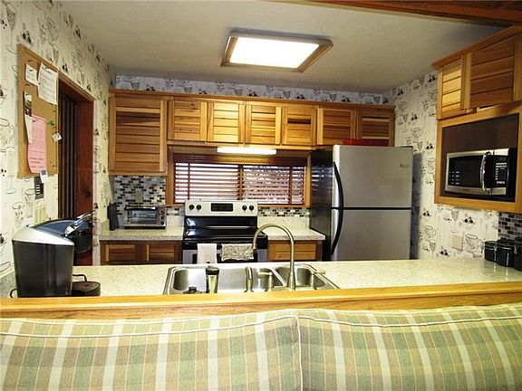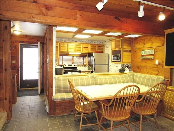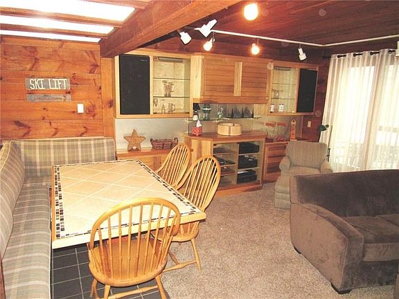 Three levels of living space! Main level offers the kitchen, dining, and living room areas. There's an eye catching, mountain stone, corner, wood burning fireplace in the living room. A sliding glass door leads outside to a second-floor deck with great winter views and shaded privacy when the leaves are out. To maximize space the dining area has a built in booth table! Both bathrooms have been remodeled! Upstairs is where you will find 3 bedrooms. There's an oversized ceramic tile shower that allows you allows you to get in and out or enjoy. There are 2 wall through AC units on this level. The finished lower level has a family room, the fourth bedroom with deep soaking tub, access to the ground level, the laundry, and storage. This bathroom offers a soaking tub to help those muscles recover from your day on the mountain! Property is being sold furnished with accessories, appliances, and the side by side washer and dryer. Seller is offering a 1year home warranty.