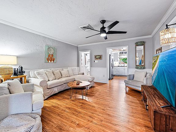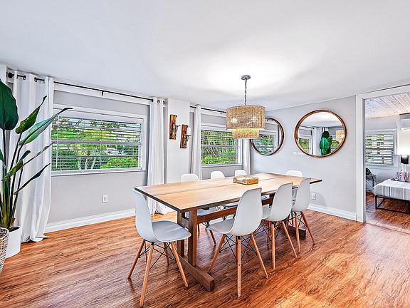 Welcome to a serene and secluded tropical paradise, a hidden treasure nestled in the heart of Jupiter. This beautifully renovated 3-bedroom, 2-bathroom residence offers an inviting and comfortable living experience, spanning over 1,220 square feet. As you step through the front door, you'll be greeted by an airy and luminous space, bathed in natural light, and enhanced by modern lighting fixtures that complement the ambiance. The home boasts luxury vinyl flooring throughout, seamlessly blending with the elegance of tile in the bathrooms, adding a sense of style and durability.The home has been updated with attention to detail, featuring crown moulding and wainscoting in the family room that add a touch of charm and sophistication. A spacious dining area provides the perfect setting for intimate dinners or entertaining guests. The kitchen impresses with stainless steel appliances, new refrigerator (2023), pristine white cabinetry, and ample storage, all set against the backdrop of stunning tongue-and-groove ceilings. This space is as functional as it is beautiful, offering everything a discerning buyer could desire. The primary suite is a peaceful retreat, featuring stylish shiplap walls and a modern ceiling fan that adds a contemporary touch to the room's inviting atmosphere. Step outside to your private backyard oasis, enclosed by a fence and surrounded by lush tropical landscaping. Here, you can unwind or host gatherings by your private pool, or simply bask in the warmth of the Florida sunshine. For added convenience, the backyard also features an outdoor shower. Recent updates include a new pool pump (2024), new water heater (2022), new washer and dryer (2022), new mini split in the front bedroom (2022), Ring security cameras (2022), and New Ecobee Wi-Fi controlled thermostat (2022), ensuring that this home is move-in ready and fully equipped for modern living. Whether you're seeking a personal haven or an investment opportunity, this property has it all. With a proven rental income of $75,000 per year, it presents a lucrative investment potential. Furniture is new (2022) and negotiable.