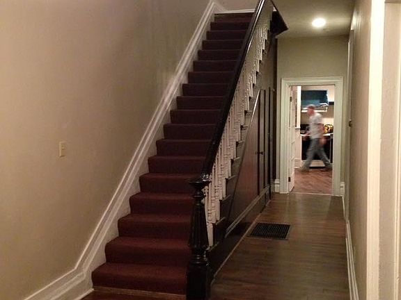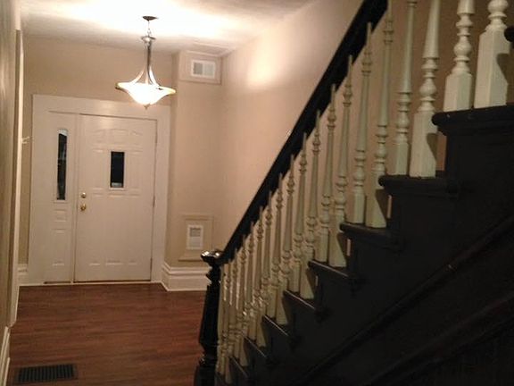 This conveniently located home is spacious and has lots of charm! The first floor has a large foyer with beautiful staircase, living room, dining room, eat-in kitchen and half bath. Kitchen includes stove and dishwasher. Easy care vinyl laminate flooring throughout the 1st floor. Exposed brick decorative fireplace divides the living room from dining room. Small porch right outside the back door which leads to a small yard. The 2nd floor has 3 large bedrooms with ceiling fans and full bath. The master bedroom has a large, walk-in closet and small office area. 2 bedrooms and staircase have newer carpeting and upstairs hall and master bedroom have newer vinyl plank flooring. The basement is unfinished but has plenty of room for storage. Washer & Dryer and Laundry tub are provided. Included in rent is water, sewage & garbage. Water & sewage is capped at $80 each. Credit check and Criminal background check required - $30 fee $850 security deposit, 1 year minimum lease. Proof of adequate income required. 1 Small dog (under 35 lbs) ok with additional pet security deposit and $25/month pet fee. No cats. No puppies. Owner pays water, sewage & trash