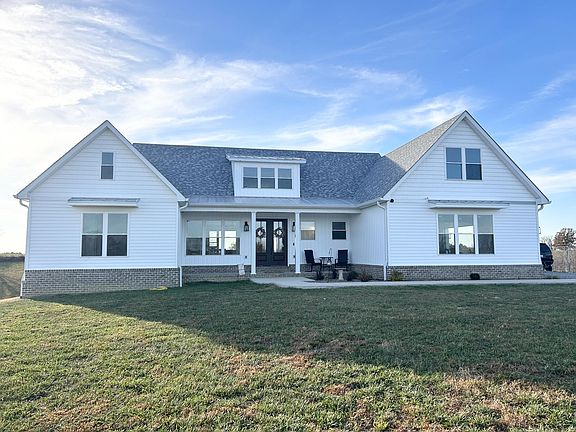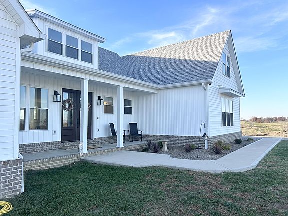 Never miss a sunset off your covered back porch! This modern farmhouse custom built in 2021 boasts an open floor plan and sits a quarter of a mile off the road on nearly 18 acres with sprawling views of the country side. This spacious property offers two main level primary suites, two car garage, quartz counter tops, floor to ceiling stone fireplace, walk in closets, home office, extra large upstairs rec room, bonus room above the garage, two large attics for storage, covered front and back porches with back porch tv/cable hookup, double oven, gas cook top, two walk in pantries and oversized windows throughout for those farm land views. Electric is already ran under the house for the future hot tub or pool. Be sure to schedule your private showing today!