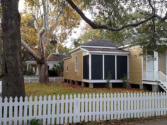 Formal living room with windows that recede into the ceiling to allow passage on to the front porch. Two bedrooms and two bathrooms. Heart pine floors with ceramic tile in the bathrooms. Nice quiet walled patio. Picket fence yard.