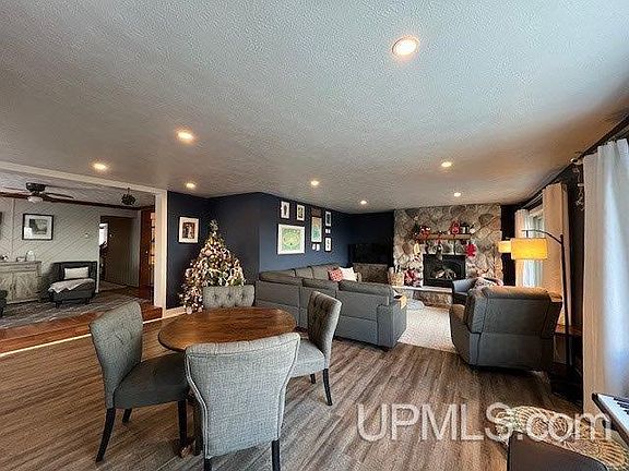 LAKE SUPERIOR VIEW and privacy in the City! A rare find! This spacious home features 5BR and 3BA tucked away in the hillside and hidden from view. Enter the main floor into the open kitchen and dining area large enough for the extended family, great for entertaining. Plenty of cabinets and storage. You will experience the WOW factor as you enter the very large living room with an amazing view of the town and Lake Superior. Enjoy relaxing evenings around the stone fireplace. Inviting master suite with a jet tub and separate shower. Two other bedrooms and a 2nd bath on the main floor. Upstairs you will find 2 more bedrooms and a large full bath. The view from the wrap around deck is awesome and you have easy access to the deck from the living room & main bedroom. There’s also a basement that has a family room area, laundry and ample storage. Central air too. Detached 2 car garage for all your toys and the yard is big enough for more. Fenced in side yard for the tots or fur babies. All of this nestled up on the wooded hills of Munising with views of the lake and a lighthouse.