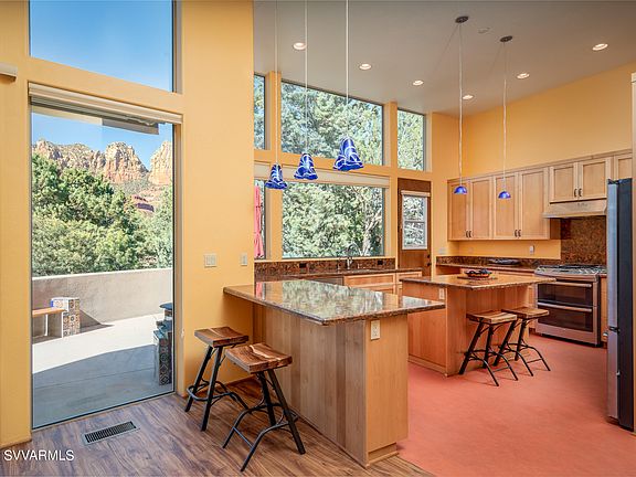 Newest home in highly sought-after Uptown Sedona with direct red rock views just yards from National Forest. Recently designed and built with a modern asthetic, this single level dream home optimizes northern views of Sedona slickrock while offering high efficiency solar panels as a hedge against rising utility costs. Modern, open kitchen showcases clean lines, top notch cabinetry, stainless appliances and A grade granite countertops. Open floorplan is ideal for guests that will be awed by the wall of glass to showcase big red rock views. Sleepy neighborhood is ideal for long term residents or establishing a foothold until you can make Sedona your destination. Local rules prohibit STRs, so you'll have no transient neighbors. Low maintentance home easy for full time or vacation getaway.