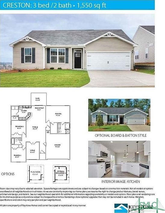 *UNDER CONSTRUCTION* The Ranch-style "Creston" by Keystone features 1,550 sq. ft. of living space with 3 bedrooms plus a flex room with glass French doors off the living room. The Owner’s suite includes dual vanities with granite countertops, separate shower and garden tub with tile surround, oil rubbed bronze fixtures, framed mirrors and walk-in closet. The spacious kitchen features white cabinets, granite countertops, stainless steel Whirlpool appliances, and breakfast bar with pendant lighting and large dining area. Enjoy LVT flooring with hardwood-look in main living areas. Covered back patio with lagoon view. 2-car garage with auto-opener and fully sodded front and side yard with irrigation. Quality Builders Warranty included! Photographs are not of the actual property but, examples of the floor plan. Features and colors may vary.