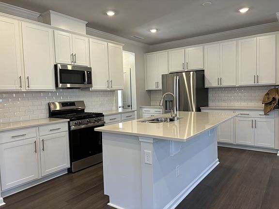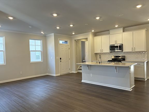 This inviting end-unit townhome presents a modern and spacious living experience across two levels. The first floor boasts an open-concept design, seamlessly connecting the kitchen with its central island, the dining area, and the comfortable Great Room, all flowing out to a relaxing covered porch. Upstairs, you'll find three generously sized bedrooms, each featuring a walk-in closet, with the owner's suite standing out thanks to its luxurious bathroom complete with dual sinks and an oversized closet.
