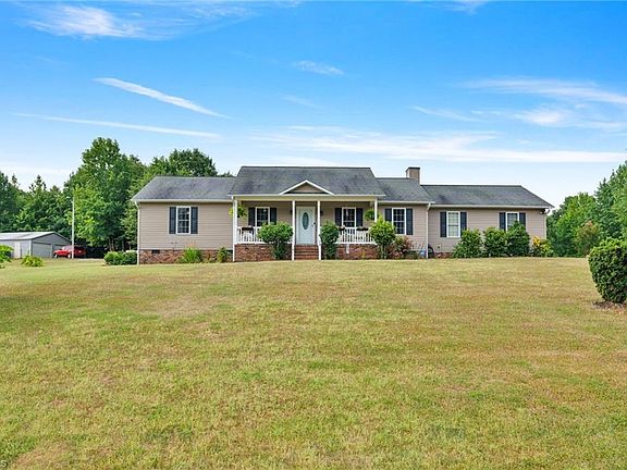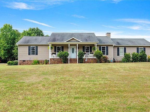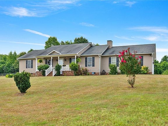 Single level MOVE-IN READY home is perched on just over an acre of land in DOGWOOD ACRES with fruit trees, blueberry bushes, and garden space galore! Relax on the rocking chair front porch or picture yourself grilling on the deck overlooking the expansive backyard because this home is freshly painted and waiting for its new owner! Living Room features vaulted ceiling, gas log fireplace and ceiling fan. Kitchen boasts updated backsplash, NEWER stainless steel sink, range, microwave, dishwasher, and refrigerator to stay! Oversized primary suite & en suite with massive walk in closet will be the envy of all your friends! Bring your toys ~ Shed to convey and there's NO HOA!! Oversized 2 car attached garage with workbench to stay is the cherry on top! Super easy access to Highway 220 makes it close to shopping & minutes to VA or Greensboro!