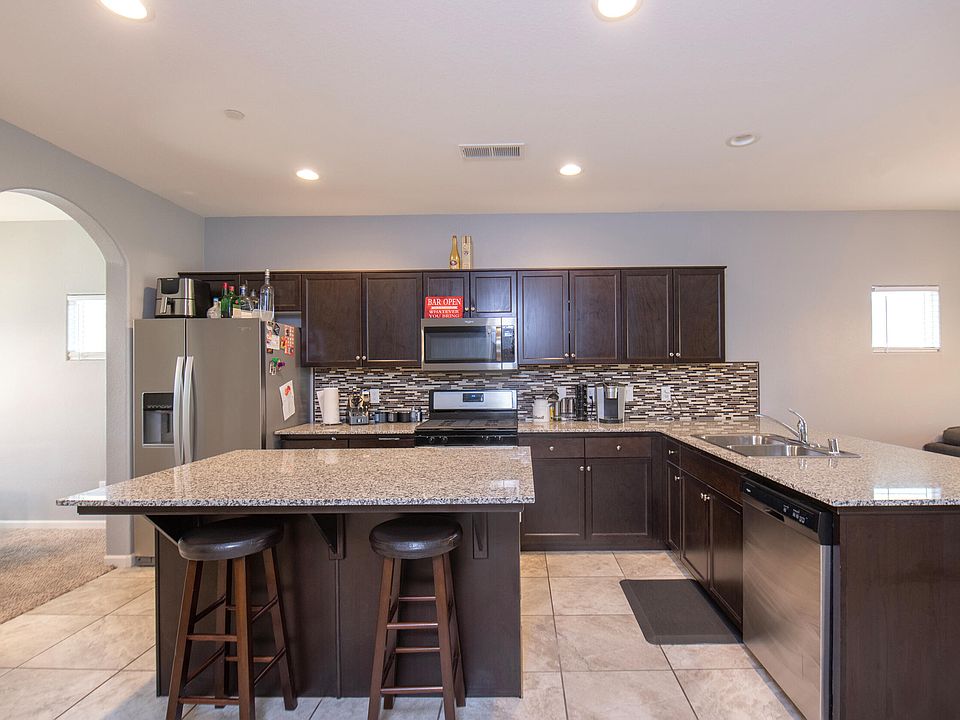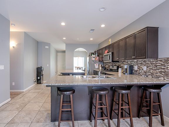 House features 3 bedrooms and 2 full size bathrooms and two car garage. The kitchen has an amazing granite island with a full backsplash and right across the open space near the living room it features more granite space. A formal dining room is located right at the entrance door. The main bedroom is HUGE and has a walk-in closet. The kitchen, bathrooms and entrance, have tile flooring.