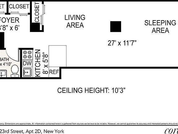 New to market residence 2D at The Foundry is in perfect move-in ready condition. Offering impressive 10ft+ ceilings this gracious light filled studio hosts a generous living area measuring 27'x11'7" that can easily be configured to accommodate a separate living room and sleeping area. The renovated open kitchen features a breakfast bar, granite countertops, and stainless-steel appliances including a dishwasher. Positioned in the rear of the building this apartment is incredibly quiet and has ample closet space. Washer/Dryers are permitted with board approval. The Foundry is a pet friendly pre-war conversion that offers a beautiful roof deck, common laundry, bike room, storage, video intercoms and live-in super. This flexible CONDOP allows parental purchasing, co-purchasing and pied-a-terres. Unlimited subletting permitted after one year of ownership. Maintenance includes cable and internet. 2% buyer paid flip tax. There is a current assessment of $105 per month ending Dec. 2022, capital raised will be going towards an upcoming new and improved roof-deck set to open this spring!