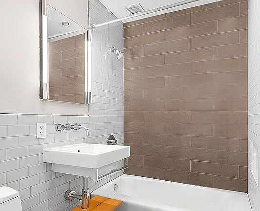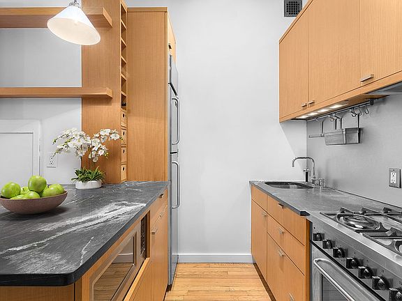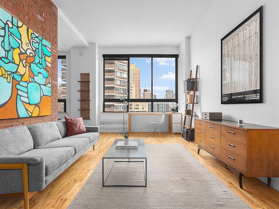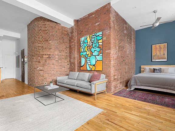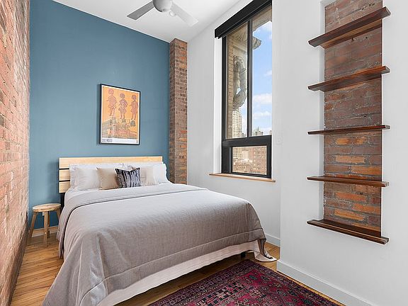 The living area features massive windows with open northern exposures with views of the Empire State Building, and a beautiful curved wall of exposed brick leading into the bed alcove with hardwood floors throughout. The kitchen has ample counter space that features a breakfast-bar, custom cabinetry with lots of storage, stainless steel appliances and backsplash.