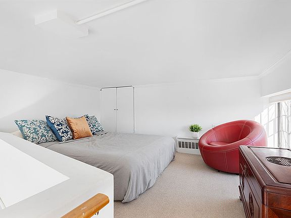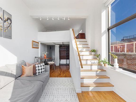 This lofted studio could easily be the brightest one on the market with soaring 11ft ceilings. The living area features massive corner windows with open south and east exposures. Every room is windowed including the sleeping loft, kitchen and bathroom.
