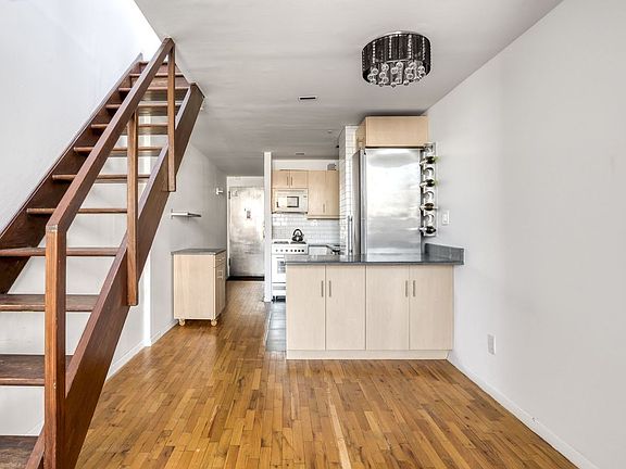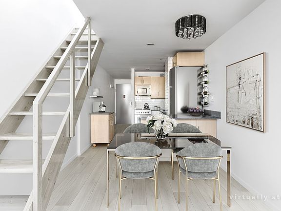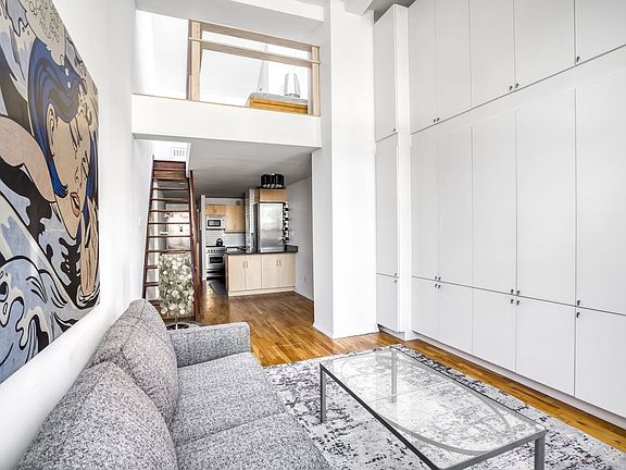 LIGHT FILLED TOP FLOOR HOME WITH OPEN CITY VIEWS, IN UNIT WASHER/DRYER, & GREAT STORAGE SYSTEMS. Enter the foyer hallway, unfolding into the kitchen, dining and living areas, which are great for entertaining. The hallway to the stone clad bathroom contains a space to hang coats, and a stackable washer and dryer. The centrally located open kitchen features a Verona oven and gas cooktop, Liebherr refrigerator, GE dishwasher, built-in microwave, and Pietra Cardosa deep-blue grey stone countertops with a breakfast bar, and many cabinets. The double height great room has soaring 13'8" ceilings, extra-large north facing windows provide great light, where you can enjoy city views, including views of the Empire State Building. There is an entire wall of floor to ceiling custom designed closets, which conceals an entertainment system. Up the stairs, sleep under the stars in the full height bedroom loft, which has skylights and dramatic 11'8" vaulted ceilings, and a wardrobe closet. There are air conditioner units and hardwood floors throughout. Maintenance includes Spectrum cable and internet, water, and radiator heat. The Foundry, is a turn-of-the-century converted factory building, and has a live-in superintendent, planted and furnished roof deck with a grill for outdoor barbequing, central laundry room, a bike room, and a new lobby with a video intercom. This well-run condop is a co-op with condo-like rules. Subletting is allowed ongoing, after just one year of occupancy. Guarantors, co-purchases, gifting, and pied-a-terre are okay. In close proximity is the 6-train, and exciting nightlife of Gramercy Park, Union Square, and the Flatiron district are all moments away.