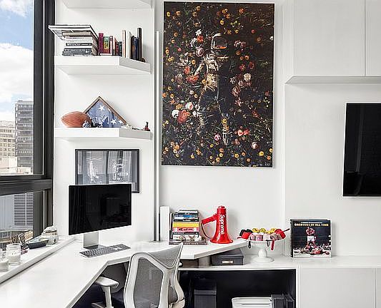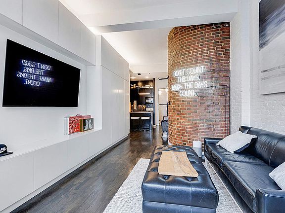 This impeccable home combines classic loft elements with smart, modern design and artful details. Featuring soaring 11 foot ceilings and a curved exposed brick wall, this spacious apartment features plenty of room for separate living, working and sleeping areas. With a wall of extra large windows facing North, it is flooded with natural light and also offers an Empire State view. A detailed full renovation includes a wall of custom built-ins featuring a fantastic desk area and shelving.