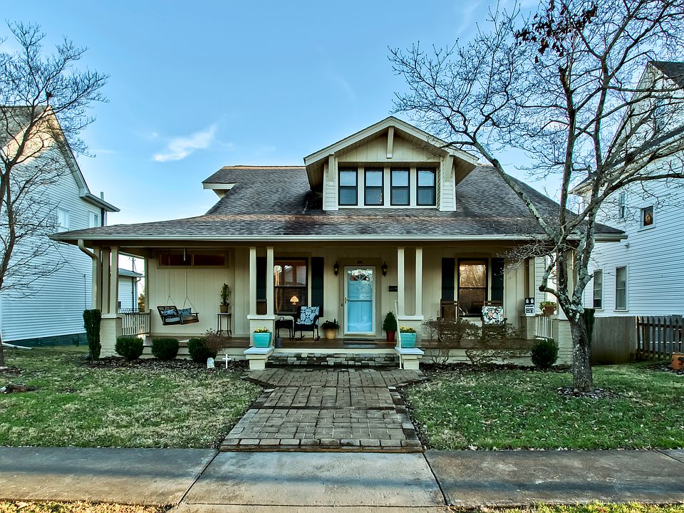 SO MUCH CHARACTER IN THIS AMAZING BUNGALOW! Located in the very desirable area of the historical district. Well maintained home, 11 ft ceilings, crown molding, original hardwood floors throughout, features a formal living area, formal dining separated by 2 sets of double pocket doors, den area offers an archway to the foyer, & original bay window, kitchen has been updated with granite counters, custom built cabinetry, master is on the main & features 2 closets, lg master bath recently updated with a double sink with granite tops, lg walk in shower with granite floor and seat, bedroom upstairs features extra closet space & lots of natural light. Outside features a lg covered front porch with beautiful wood floors, 2 screened porches at the rear as well as a deck with lake & mountain views.