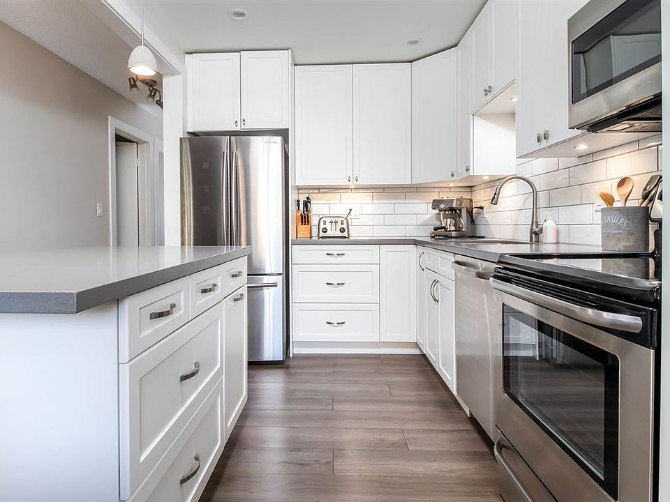 Beautifully renovated two-bedroom condo in Lower Lonsdale's Hillshire Place. Property offers a wood burning fireplace, stainless steel appliances, insuite laundry, and a covered balcony with views of downtown. Building features a new roof (2020), secure parking, and a private storage locker. Minutes to Quay, SeaBus, and everything Lonsdale has to offer. Virtual tour available.