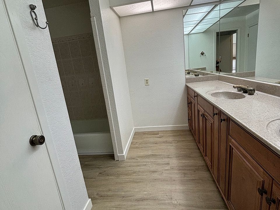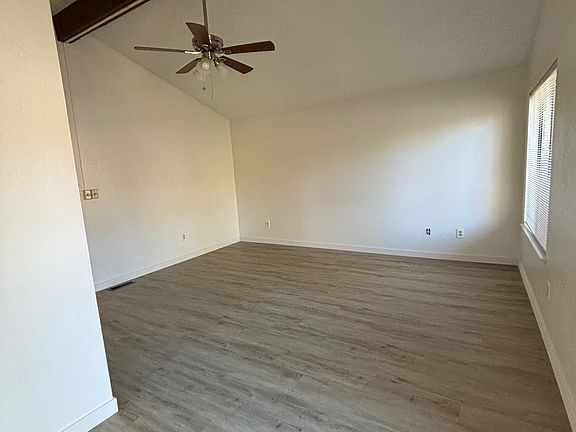 Home is spacious with high ceilings and open beams. Private fenced yard. Beautiful new LVP flooring throughout. 2 car garage and ample closets. Community has a pool and tennis courts. One year lease (to start). Pets upon approval.
