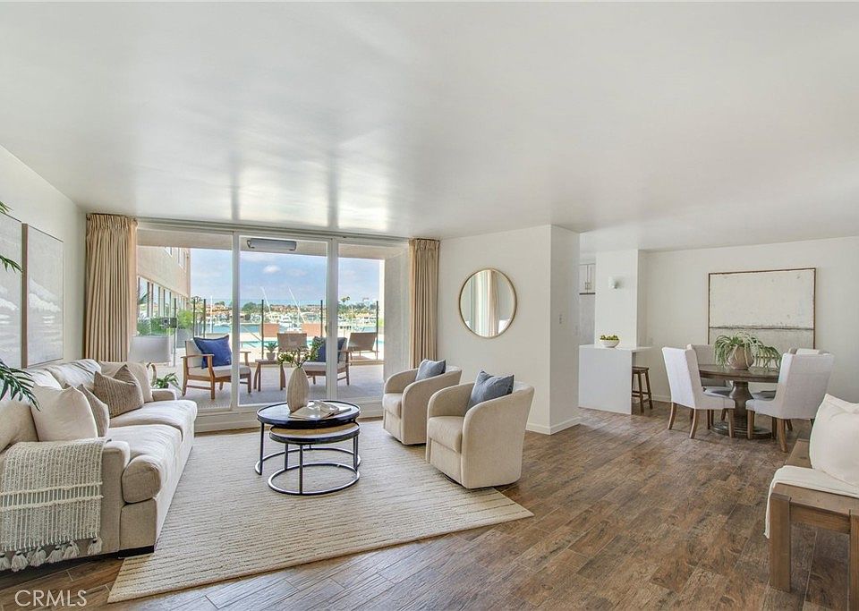 Welcome to Newport Bay Towers on the bay front overlooking the harbor in the heart of the Newport peninsula. Located on the first level, this turnkey 2 bedroom, 2 bath condo offers a spacious floor plan and beautiful bay views. Step inside and be greeted by a large living room that seamlessly flows into the dining area and kitchen. Sliding glass doors lead to a private patio overlooking the sparkling pool and the harbor. The kitchen features quartz countertops, stainless appliances and bar seating. Unwind in either of the two generously sized bedrooms, each featuring a walk-in closet for all your storage needs. Both bathrooms have been remodeled with walk-in showers and quartz countertops, offering a touch of modern luxury. The primary suite boasts its own private patio, perfect for enjoying your morning coffee. Thoughtful details such as wood-like tile flooring throughout adds a touch of warmth and comfort, while the washer and dryer within the unit provide convenience. Beyond your unit, Newport Bay Towers offers a secure building with subterranean parking and storage. This particular unit comes with two designated parking spaces - one conveniently located underground and another perfect for guests at street level. Indulge in the resort-style amenities including a pool and a roof deck with spectacular views of the bay, ocean and city lights. Additionally, the community offers dock space with slips to accommodate Duffy boats and larger yachts with priority for homeowners. This property is being offered with an 18’ Classic Deluxe Duffy boat with its own slip and a reasonable monthly slip fee. Newport Bay Towers sits in a prime spot, within walking distance to the lively Balboa Fun Zone, charming Balboa Island, the world-famous Wedge surf spot, and all the vibrant attractions the peninsula offers. Embrace the quintessential Newport Beach lifestyle in this luxurious bay front condo.