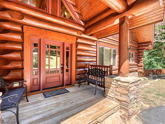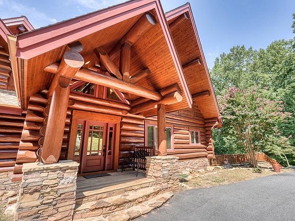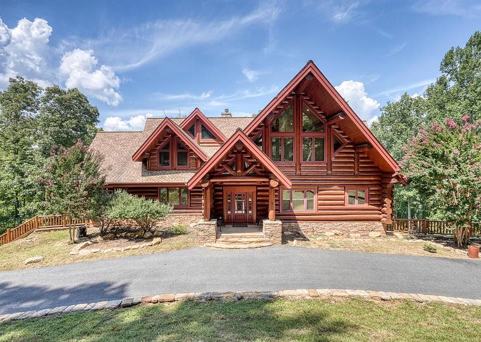 Perched high above Lake Nottely with sweeping mountain views, this custom-built lodge-style log home showcases the warmth of massive Douglas Fir timbers imported from British Columbia. Meticulous craftsmanship shines throughout with soaring ceilings in the great room and primary suite, complemented by 10' ceilings across the main level. The open floor plan flows effortlessly to expansive decks and patios, creating an entertainer's dream with endless views. The chef's kitchen boasts Thermador appliances and a built-in Sub-Zero refrigerator. The main level hosts a luxurious primary suite, an additional en-suite bedroom, and a convenient half bath. Upstairs offers a spacious loft and another en-suite, while the terrace level provides a cozy den with fireplace, wet bar, a guest suite, plus both a full and half bath. Two oversized 2-car garages, a workshop, and an elevator add unmatched convenience. Set on over 4 wooded acres with paved access, this private retreat combines rustic elegance with modern luxury. Being sold mostly furnished.