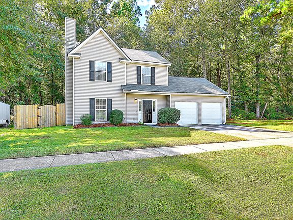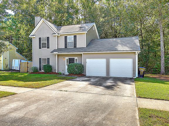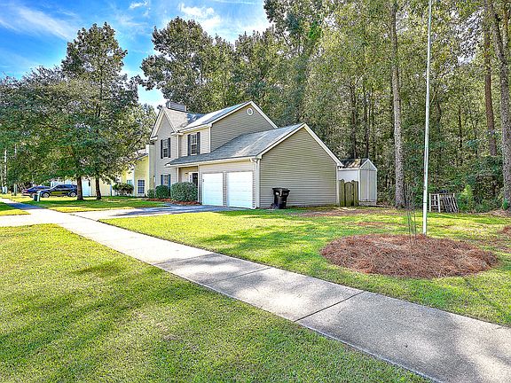 This lovely home with a finished 2-CAR garage sits on a large private lot surrounded by mature trees. Upon entering the home, you're immediately greeted into the spacious family room, which displays a cozy fireplace with shelf area (perfect space for your TV), a sizable coat closet and an upgraded ceiling fan. Dining area is open to the family room and kitchen. Bright kitchen offers stainless steel appliances (refrigerator conveys), ample cabinets and counter space. Sliding glass door in dining area, leads to patio, fenced in back yard and an 8X12 custom shed. And...don't forget the 2-car garage with garage opener ~ it offers tons of storage, shelving and it's a perfect space for a workshop! A powder room is conveniently located off the kitchen. The master bedroom is located upstairs ~ it features a nice sized closet; ceiling fan and master bath has a tub/shower combination and vanity. The other 2 bedrooms, guest bathroom are located upstairs as well as large linen closet in the hallway. Additional storage near stairway is perfect for holiday decorations or any other items needing to be stored. If you suffer from allergies, this home is perfect for you! The only carpet in this home is on the stairs ~ the rest is laminate flooring. Ceiling fans are featured in all bedrooms as well as blinds throughout. The large lot offers plenty of space for a boat, RV or trailer to be parked on the property for convenience~ so no need to store these items elsewhere. This well-cared for property is centrally located to all the conveniences of the Goose Creek area... Restaurants, shopping, schools, etc... Home is move in ready!!