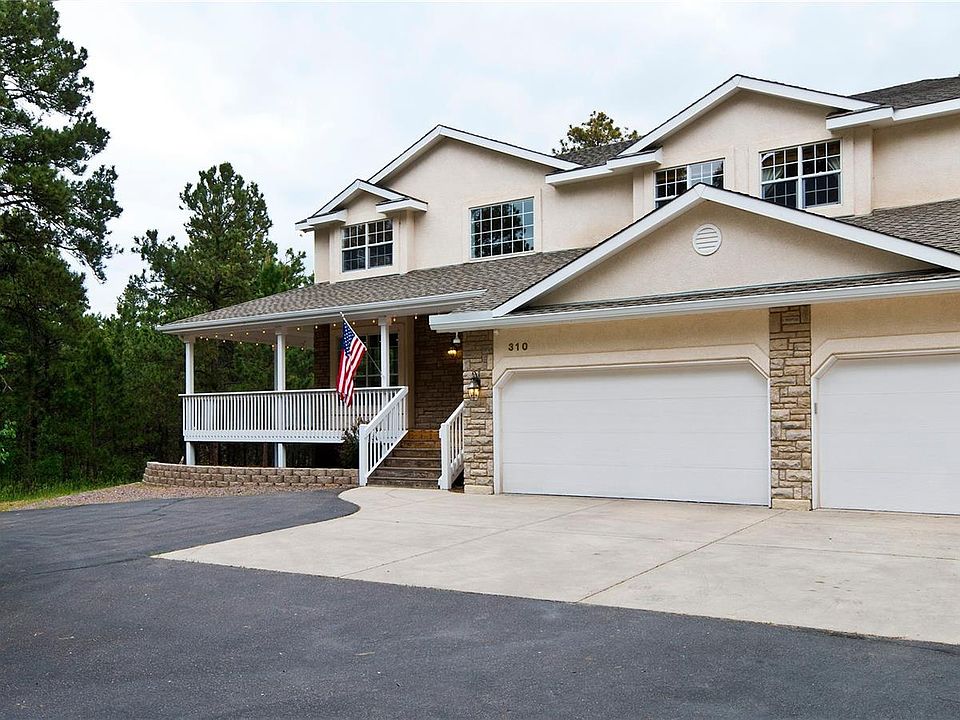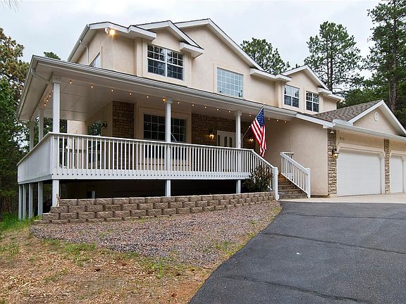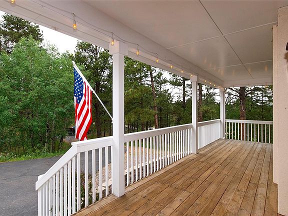 Outstanding Arrowwood private home! Wraparound 1,000 sq ft country style porch. Detached, finished, extra 2 car Garage plus Shop! All hardwood main living areas, brand new carpet on upper and lower levels. Kitchen with island, pantry, eating bar, SS appliances, 42" maple cabinets, tile backsplash, glass smooth-top range, undermount stone sink, eating nook with walkout to private rear deck. Formal Living and Dining Rooms. Hardwood Family Room with gas fireplace. Vaulted Master Bedroom with adjacent 5-pc Bath with jetted tub, 10'x8' walk-in closet with window. Four Bedrooms and 2 Baths plus Laundry upstairs. Finished walkout Basement with Rec Room with gas fireplace, wet bar, Theater/Bonus Room, fifth Bedroom and full Bath. Well (new pump in '19) & Septic systems, circular drive, all on a private wooded lot. Interior trim to be repainted. Easy access to Monument & Tri-Lakes shopping, dining, recreation, and entertainment. Excellent D38 schools, 35 minutes to DTC.