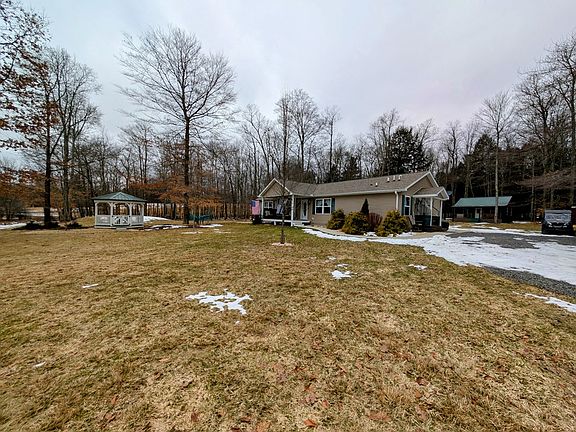 Welcome to your serene retreat! This charming 3-bed, 2-bath home, built in 2014, combines modern upgrades with rustic appeal. Enjoy the warmth of white oak floors and the inviting ambiance of a wood stove, supplemented by forced air propane heating. The updated electric system features convenient outlets in cabinets, while soft-close cabinetry adds a touch of elegance. The home boasts a finished concrete floor in an insulated crawl space and blown insulation in the attic for energy efficiency. Step outside to discover a beautiful gazebo and a wishing well, perfect for relaxation. The expansive property includes a 12x28 workshop, an 8x10 hunting shed, and a 24x28 cabin with a 6x24 porch, all set against a backdrop of 10.5 acres with meticulously maintained trails. Additional features include custom tarps for the porch, a generator-ready setup, a reliable salt filtering system, and a wood shed to store your firewood. Don't miss this unique opportunity!