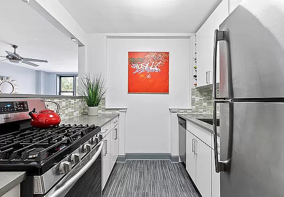 This lovely junior 4 has been converted into a one-bedroom plus separate office space/ guest room. It also has an exquisitely renovated kitchen and bathroom. Commanding leafy views from the fifth floor, the gracious layout offers comfortable living with excellent closet space. Bonus, the Energy Star appliances and LED lights will keep your energy use down to a minimum. The generous foyer allows you to sit and remove your shoes while also providing a space for whatever packages have arrived that day. After hanging your coat in the entry closet, a large picture window draws you past the dining area into a bright expansive living room ideal for relaxing after a long day. Then, dish up a home cooked meal in the modern kitchen equipped with quartz counters and a five-burner gas stove with a dual oven. Load the dishwasher before soaking in the luxurious 18" deep European-style tub in the no-expense-spared bathroom lined with chevron patterned marble tiles. Wind down in the immense bedroom that easily accommodates a king-size bed leaving space for a full bedroom set and sitting area. The well proportioned second room currently serves as a guest room and home office. The hallway is lined with closets in addition to a double closet in the primary bedroom. In wall air-conditioners are located in the bedroom and living room keeping your windows free and clear all year round. The Gentry is a pet-friendly gated community consisting of two buildings with a parking deck below. A newly hired on-site Super takes great pride in his work keeping the welcoming lobby, package room and laundry rooms (on every floor) clean and operative. Located one block south of Prospect Lefferts Gardens close to the Kings County Hospital and SUNY Downstate with the 2,5 and Q trains nearby. Try out some local eateries including Aunts et Uncles' vegan fare, comfort food at Daleview Biscuits and Beer, or enjoy an upscale Italian meal at Camillo. Prospect Park is close enough to burn off those calories on a daily basis. Subletting is on approval after two years of residence. Pets are permitted, but owners are restricted to one dog that weighs 20 pounds or less.