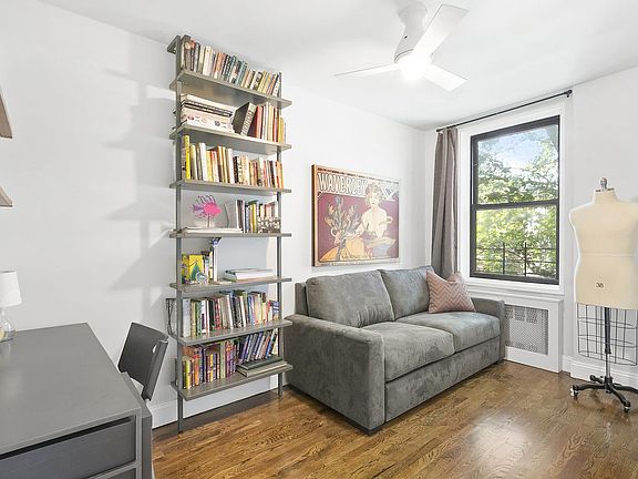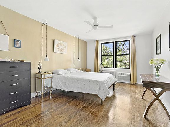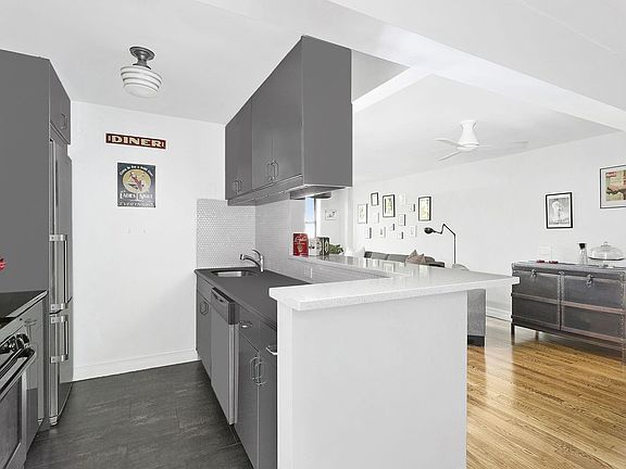 Junior 4 converted to a 2BR: Did you know that northern exposures provide soft light all day long and are known to be calming? Here, all windows face North and, from the fifth floor, your house plants would flourish too. Stepping inside, you will immediately feel at home knowing there is plenty of space to live comfortably. The floor plan has been enhanced by adding a bedroom and creating an open kitchen. The fully renovated kitchen has stainless appliances including a gas stove, quiet dishwasher and refrigerator. A breakfast bar divides the living space nicely with the dining area flowing into a large living room with treetop views. Privately located down the hallway, lined with closets, is a huge bedroom next to the fully tiled and stylish bathroom. In-wall air conditioning units are included. The Gentry consists of two elevator buildings with laundry facilities on each floor and a secure entrance gate. The building has a package room, storage and parking for both bicycles and cars (wait list for the garage). Located just south of Prospect Lefferts Gardens near Kings County Hospital and SUNY Downstate with good transportation; the 2, 5 trains at Winthrop and B, Q at Parkside. Prospect Park is close enough to enjoy on a daily basis. Pets are permitted on approval. Please contact listing agents, Kirsten Syrett or Sarah Chamberlin, for accurate information