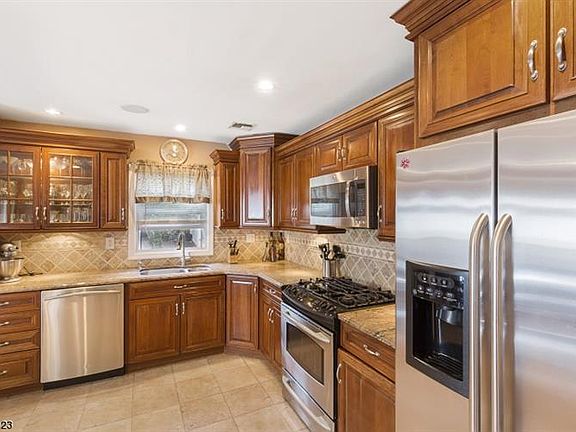 This 3 BR 2 and a half Bath Custom Split Level on a quiet dead end street can easily be converted back to a 4 BR home. It features a large updated eat-in kitchen with tile floors, granite countertops, under cabinet lighting and SS appliances. The Kitchen is open to the large Living Room with beautiful bay window, cathedral ceiling and hard wood flooring.The Master Bedroom has Master Bath with stall shower. All 3 bedrooms have, recessed lighting, HWF under carpet and ample closet space.The Family Room has half bath laundry room, Gas Fireplace and sliders to the backyard. The fenced in yard features an above ground pool, composite deck, pavers patio, bar, and pond with a waterfall. There home has CAC, 2 car attached garage and storage, full basement ready for finishing .Close to Shopping, Parks, Schools and Transportation
