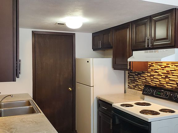 The Kitchen sparkles with Brand New rich wood Cabinets, Countertops, Faucet, Range Hood, and Designer Tile Backsplash. Refrigerator and stove/oven are included.