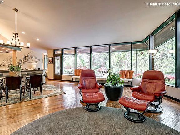 Stunning Street of Dreams home inspired by Frank Lloyd Wright disciple. Located in Waterhouse and backing on community park and lake. Features incl hickory floors; upstairs master suite with soak tub, walnut and granite, walk-in closet; kitchen with custom alder cabinets, gas cook top, new refrig; dramatic wall of windows in great rm and large brick fireplace; newly-remodeled master suite on main with walk-in closet and completely remodeled bathroom with tile floors, granite-top vanities, marvelous free-standing bathtub, and tiled shower; .27 acre lot with lovely grounds and exceptional privacy.