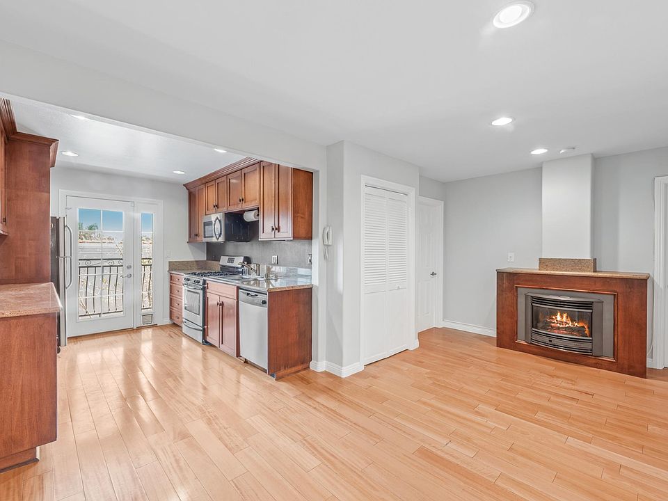 Downtown Art district/Long Beach. Lovely upper corner unit (smaller 6 unit complex) 2 bedroom 2-bath condo with private balcony located in the East Village Art District of Long Beach. Walking distance to the beach and many coffee shops, restaurants, Aquarium, Queen Mary, and metro to Downtown Los Angeles. Freshly painted! Master bedroom with on-suite bathroom that includes spacious walk-in shower and granite counter tops. Wood flooring throughout, including bedrooms. Kitchen includes granite counters, wood cabinets, stainless steel gas stove, dishwasher, & sink. Bedrooms include ceiling fans and closets with mirrored doors and built-ins. Includes gas fireplace for heat. 2 dedicated Parking spaces included in gated first floor parking garage- must have in this area! Two storage cabinets in Parking Garage for additional storage needs. Newer Washer/dryer combo unit and Refrigerator will be left in condo but will not be maintained by owner. Installation of window a/c or satellite dish is not allowed. Up to 2 cats allowed (no dogs) with an additional deposit of $250/cat. No Smoking. Landlord pays water and trash. Deposit equal to first months rent. Available for viewings starting May 15th.