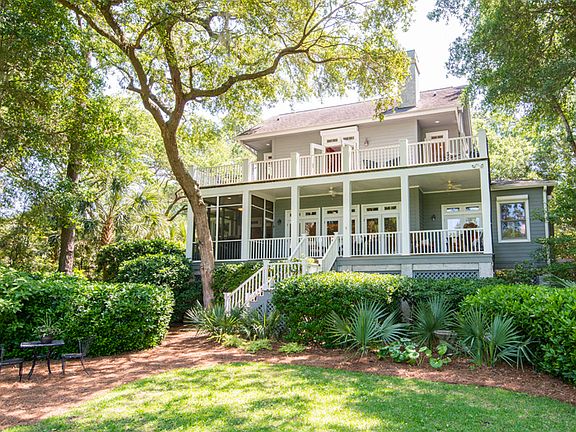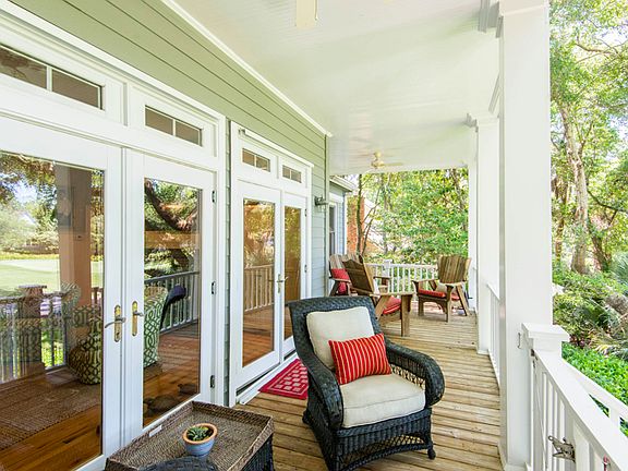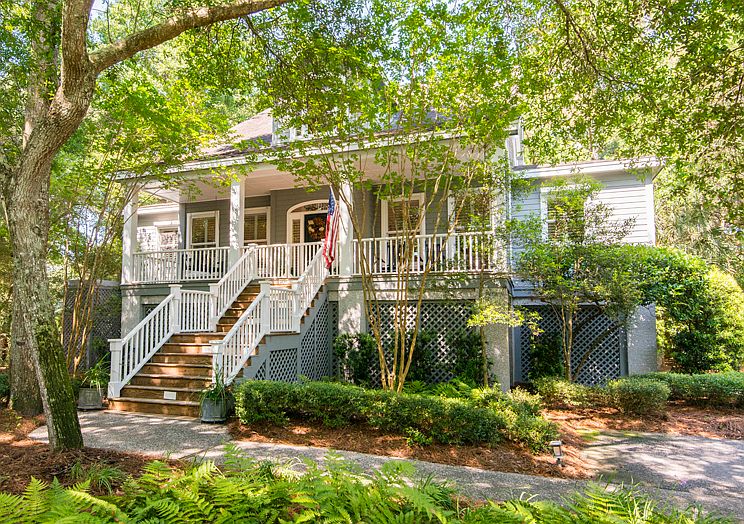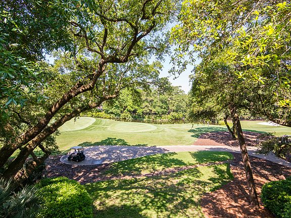 Nestled on a quiet cul-de-sac street on Kiawah's western end, this beautiful home enjoys a generously sized lot with lush landscaped grounds, signature live oaks, and spectacular views of Cougar Point golf course's No. 14 tee and lagoon beyond. Kiawah's 10-mile beach is just 700 yards away. An inviting front porch extends the façade of the home and overlooks the private front lawn. An arched entry door with glass sidelights opens into a dramatic two-story foyer with site lines out to the verdant golf course. Renovated in 2012, the home has been refreshed in a soothing coastal color palette and enjoys an open floor plan with panoramic views that foster an extraordinary sense of calm and relaxation. The first floor features oak hardwood flooring, twelve-foot ceilings, five-foot shiplap wainscoting, crown molding, custom built-ins, and a wall of oversized transom-topped French glass doors that open out to the veranda and screened porch. A gated stairway descends to the tree-lined back lawn and closer views of the golf course and water. The living room with fireplace and dining room are open to each other, as well as to the kitchen, veranda and screened porch. With room enough for a grand piano, the shared living space offers a wonderful flow for entertaining. Delineated by graceful columns, the dining room seats ten comfortably. The gourmet kitchen is designed for cooks who love to entertain and socialize. Bright and sunny, it features shaker style glass-front cabinetry, granite perimeter counters, and a contrasting granite-topped island that offers casual bar-height seating. High-end stainless steel appliances include a Viking 4-burner gas cooktop with griddle, Viking professional grade wall oven, microwave, and a Jenn Air refrigerator/freezer. Just off the kitchen, the screened porch enjoys tall beadboard ceilings, fabulous views, and ample space to dine al fresco. The screened door also accesses the back veranda and back yard. The first-floor master is embraced by beautiful vertical and horizontal picture windows and French doors that open to the rear porch. The spacious suite features a custom built-in armoire with soft close drawers and hanging bars, plus a customized walk-in closet. The spa-inspired private bath offers dual marble vanities, custom-built cabinetry, and an expansive marble-appointed shower with hand-held, jet, and rain showerheads with a glass block wall. Currently used as an office, a second first-floor bedroom with private bath enjoys views of the front lawn. Upstairs, two generously sized bedrooms feature hardwood flooring, marble-appointed private bathrooms, light-filled picture windows, and French doors out to the second level deck that overlooks the golf course and lagoon. Each bedroom offers a large clothes closet, plus an expansive walk-in closet. The spacious second floor library/family room offers ample space to relax and unwind with a book. Transom-topped French glass doors open out to the second level deck. A Kiawah Island Club Membership--available for purchase with this home--ensures you will enjoy an exhilarating lifestyle filled with social and sporting abundance. Additional features of this move-in ready home include a walk-in pantry/laundry room off the kitchen; a private drive with ample parking; 2-bay garage (accommodates up to four cars); multiple storage closets in the garage; chair lift from the garage level to the first level; 5-speaker surround sound system (first floor); and exterior landscape lighting. Exterior living spaces include: front porch (220.2 sq. ft.); screened porch (107.9 sq. ft.); first floor veranda (301.2 sq. feet); and second level deck (417.8 sq. ft.).
