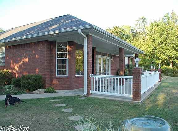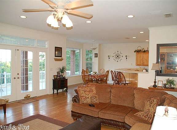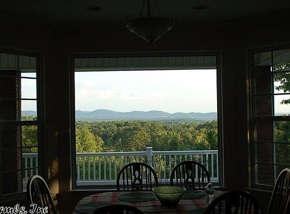 Hard to imagine this view from this secluded home. Open floor plan. So many extra's: stocked pond, included woodland and pasture areas, workshop with overhead door. House has great room with built-ins, media center. Wired for surround sound. Kitchen has slide-out cabinetry, tons of storage. Also includes safe room, gas fireplace; master suite has bay window, jetted garden tub. Fenced back yard area. Trails throughout the 11.6 acres, and just a few miles from town.