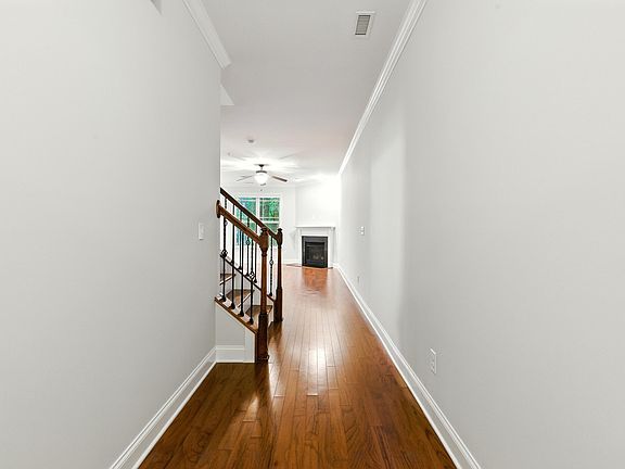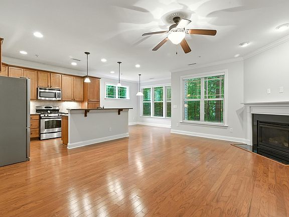 Stunning end-unit townhome in sought-after Rose Walk! This beautifully appointed home offers one of the community's most desirable floor plans. The light-filled main level features a welcoming family room, a chef's kitchen with bar-height island, granite countertops, gas range, under-cabinet lighting, and abundant cabinetry. A wall of windows in the breakfast room overlooks the wooded backyard and opens to a private patio with direct access to the neighborhood recreation trail. An office nook and mudroom provide added convenience, leading to the two-car garage. Upstairs, the luxurious owner's suite boasts a tray ceiling, spa-like bath with soaking tub, walk-in shower, dual vanities, and a generous walk-in closet. Two additional bedrooms share a full bath. The third floor offers a versatile bonus room with wooded views, a third full bath, and over 480 sq. ft. of walk-in storage. Prime location—just steps to the Park & Ride off Berryhill Dr., moments to downtown, shopping, and dining.