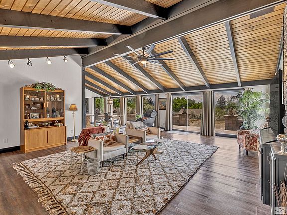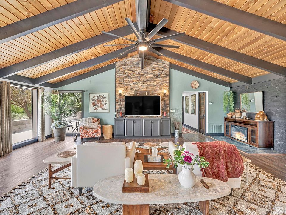 SIMPLY SPECTACULAR – from the panoramic VIEWS that extend all the way past Job’s Peak to the totally updated one level open floorplan with dramatic vaulted ceilings throughout. This versatile house configuration can be a 3 bedroom, 2 bath home with an attached guest quarters that has a living room, kitchenette, bathroom and bedroom with a separate entrance. OR this can be a 4 bedroom, 3 bath home that has a separate family room with a gas log fireplace and a small kitchenette. The location cannot be beat!, This property is centrally located in a rural area with close proximity to the regional hospital, freeway access to Reno or Tahoe, nearby amenities and restaurants but loads of privacy with space for everything! This special property can be perfect for many different living situations. Off the great room is a screened in 17’ x 7’ porch. The south side of the main house has mainly large windows that not only capture the fantastic views but also act as direct solar heating in the cooler months. And the great room draperies have the blackout capacity to keep the house cooler in the summer months although the main house has a commercial grade A/C unit. The house has been updated from the refurbished solid wood cabinetry to the popular luxury vinyl flooring to the stainless-steel appliances to some of the electrical to the solid wood doors to the newer furnace and water heater. There are 5 ceiling fans through the house to circulate the air. There is a detached almost 3 car garage that has a separate electricity meter for those who want a workshop area. The large front yard is ready for some xeriscaping although there are sprinklers if a lawn is preferred. There is plenty of room on the 1.02 acre lot for RV parking and a barn, corral or horse-set up since horses are allowed on this property. There is a stamped concrete front porch that extends across the entirety of the southern side of the house and there is wiring for a hot tub on the patio near the master bedroom door. The property is on a well and there are 2 filter systems in the well house, and filtration system under the kitchen sink. This is the perfect location for someone who wants views, space but with close proximity to freeway access, local amenities and hospital, a possible guest or in-law setup, and mostly TREMENDOUS PRIVACY!!