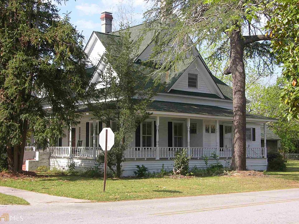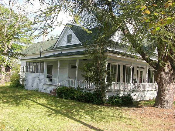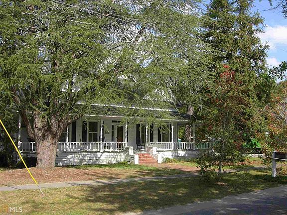 Beautiful historic home with original hardwood floors and tongue & groove walls throughout the house in a quiet neighborhood within walking distance to town. Enter into the living room, with a 12ft high ceiling, from the wrap around porch. There is a formal dining room. There are three bedroom downstairs with ceiling fans. The master bedroom has its own private bath with an old footed tub. There are two additional baths downstairs and a laundry room. The kitchen/breakfast room has a lineoleum floor, formica countertops, double stainless sink, an island with the cook top, built in double ovens, and refrigerator. There are two bedrooms upstairs that have ceiling fans, carpet and are paneled. The house has central heat/air. There is a storage building in the
