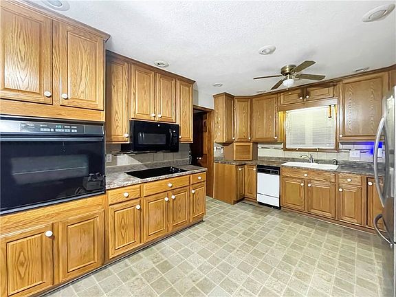 - Ceiling Fan(s), Custom Cabinets, Stained Cabinets