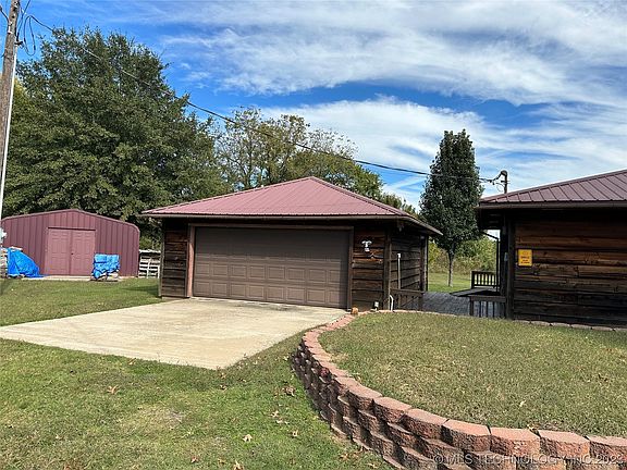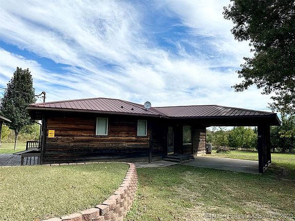 Come enjoy the peaceful country life in this adorable cabin featuring 2 bedrooms. Each bedroom has its own attached bathroom and walk-in closet. Central air and heat. Laundry room. The open living area has built-in shelves, a wood stove, and a dining area. The kitchen is open to the living/dining area so you won't be left out of the action while cooking. Big windows look out onto the back deck and beautiful view of nature. A metal roof, single carport, double garage, and big storage building are some of the outside features. Approx 1.6 acres.