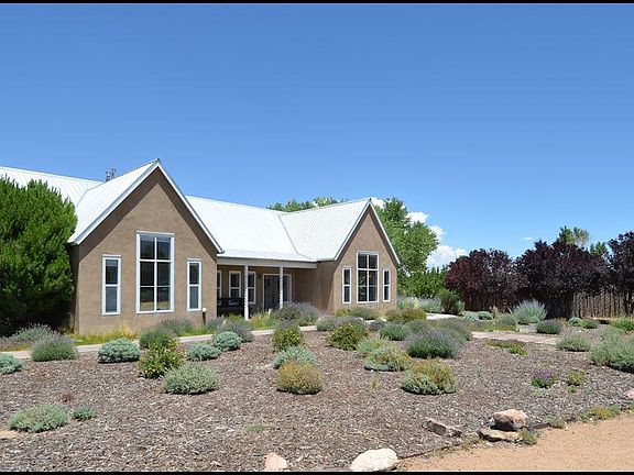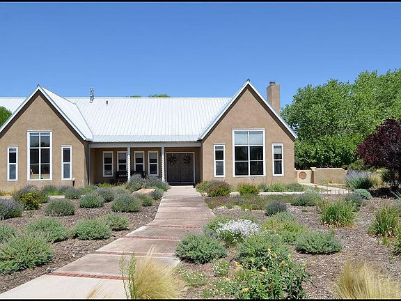 Beautiful setting for this Northern NM Style home with tennis court. Views, great location and area of fine homes.Two level 4BR/4BA/3car, home w/high soaring ceilings, dramatic stairway, hardwood & saltillo floors. 2 living areas,sculpted kiva FP, formal dining, HWBB, stainless steel appliances, granite in country kitchen. One BR & a full bath on main floor. 1/2 BA in garage. Second level has the 3BR's, study, laundry room, and more views! This is a spacious home that deserves a new family and some updates. Fabulous, private yard, grassed, fruit trees, and lush gardens to enjoy from the many patios. Coyote fencing, adobe wall and separate tennis court area that would could also be turned into a horse area. Easy access to open space and trails. Room for a pool! Ready to sell!