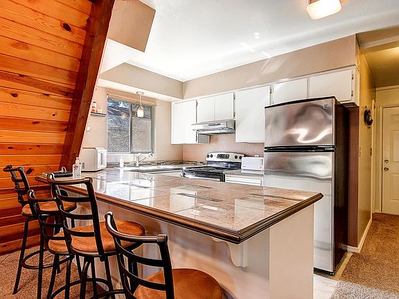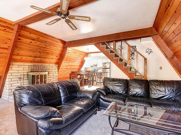 Adorable remodeled A-frame chalet with fireplace to cozy up to on chilly evenings. Very clean and ready for new owners. Newer carpet, flooring, kitchen countertops, and backsplash make this move in ready. Home was just repainted as well. There is a downstairs bedroom and one full bath and a loft with two separate areas used for sleeping. Plus a half bath with laundry on upper level. Easy to show! Easy to love!