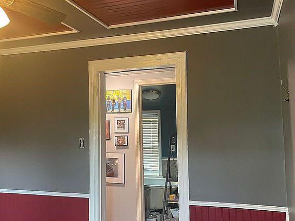 This grand old home has been updated in 2016 with new plumbing and electric. Newly updated bathroom with a beautiful claw foot bathtub to soak the worries away. Behind the bathroom door is also a walk in tile shower with dual shower heads. The home has central ductless air/heat in 4 rooms. Front lawn is surrounded with White picket fence with covered front porch and red awnings matching the red metal roof. The living room is grand for the entrance as you open the front door. Original hardwood floors have been restored and showcases the age of the house inside. The downstairs Master Bedroom has a very big walk in closet with shelving on both walls. It also has a speckled nylon carpet for comfort in the master bedroom. Ship lap walls are original as you see the Original Wood in the entrance, staircase, hallway and master bedroom walls. Faux cauford ceilings in the living room area and master bedroom highlights the original wood ceilings. Barn doors keep the master bedroom elegant and private. One bedroom down & two up. Kitchen has pass-thru to dining area. Oak kitchen cabinets line the kitchen walls With tile countertops. The kitchen, dining room and laundry room have tile floors throughout. Upstairs bathroom is hidden away and has a toilet with sink. The landing has carpet and a cubby/landing wide enough to sit & read books or take naps before entering the bedrooms. 2-story outbuilding w/carport. Sold as is.