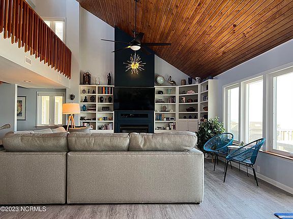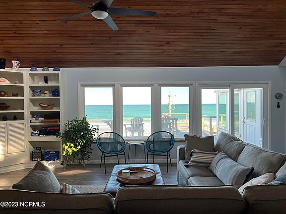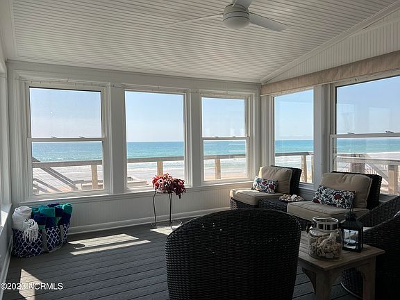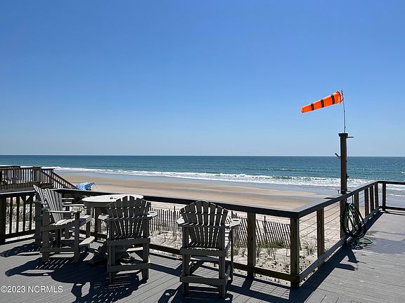 Gorgeous Modern-Style Home with Unique Features. Enjoy the ultimate beach lifestyle in this stunning 4-bedroom, 3-full-bath home near the heart of Topsail Island, just blocks from Surf City restaurants and shopping. The house features a well-laid-out gourmet kitchen with custom cabinetry, sleek quartz countertops, and high-end appliances. The spacious living areas and custom dry bar offer an inviting atmosphere for entertaining and relaxation. Take advantage of the unbeatable ocean views and picturesque sunrises from the sunroom or the private decks off the bedrooms. The property also boasts an indoor/outdoor ''Tiki Bar'' pub on the lower level deck, perfect for parties or enjoying drinks with your guests. The double lot with 100 feet of frontage offers ample space for parking, while the four garages provide enclosed parking and extra storage for your toys. Additional features include a conditioned lower level gym, a composite wrap-around deck with SS cable railings, outdoor showers, and good dune structure. Built as a residence, the home offers tons of storage, including His and Hers walk-in closets in the main bedroom, several storage closets, and two large walk-in attics. The house was renovated in 2018 and never rented, however it has a very successful prior rental history. Brand new heat pump compressor 4/2023.The property is being sold partially furnished (see list for exclusions). This is a great opportunity to own a luxurious beach retreat in a prime location!