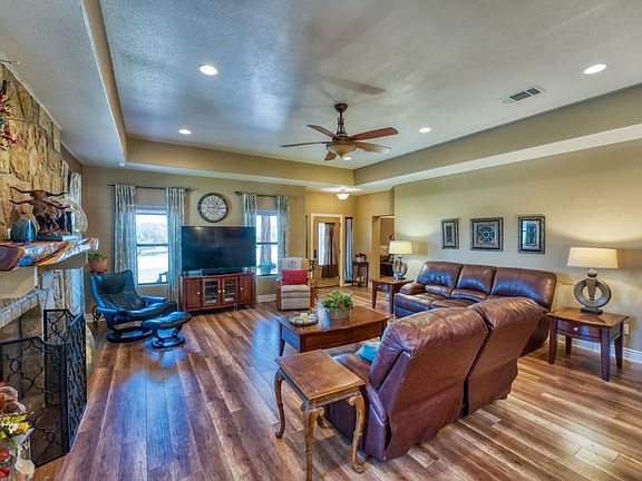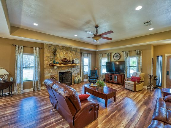 Beautiful rock home in upscale rural subdivision. Underground utilities and ribbon curbed paved roads. Entire subdivision is ag exempt with a herd of black buck antelope. House has metal roof, 2 car extra large garage w/ area for workshop. Kitchen has granite counter-tops, kitchen aid appliances, stove is gas cook top and electric double oven. Large walk-in pantry, maple cabinets, Large family room with fireplace (gas logs but can be converted to wood burning) with beautiful cedar mantle.