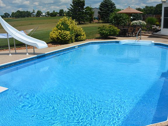 Looking for the serenity and beauty of country living, but the convenience of schools, shopping, eateries, and banking nearby? With 2 acres of land, this rural setting residence backs up to farm acreage in the rear and onsite professional landscaping which includes multilevel garden ponds w/waterfall, flower gardens, large yard, circular drive & detached 1-car garage. The 2484 SF, brick & vinyl custom-built, 1.5 story home has an inground pool, adjacent sun room with a full wet bar, 3 bedrooms, 2.5 baths, 2-car attached garage, large family room with WBFP, completely updated kitchen w/granite counter tops and new back splash, all-new Master bath w/quartz counter top, full W/I tiled shower, dbl vanity & WIC. First floor has DR, LR, Family Rm, Sun Rm, Utility & 1/2 bath. Second floor includes owner's suite, 2 bedrooms, loft study and 2nd floor updated bath. Amenities include geothermal HVAC, hardwood floors, bow windows, 6-panel doors, cathedral ceilings, & open staircase.