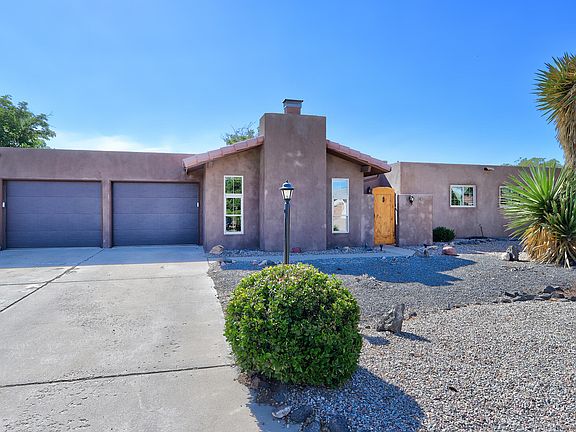 Discover refined living in this 3-bedroom Rio Rancho gem and enjoy the serenity of a 1/4 acre lot with Sandia Mountain views. A custom wood door welcomes you inside from the Courtyard, where you'll find thoughtful touches throughout from the elegant wood trim to soapstone sinks and a rain shower. Updates include modern essentials like Refrigerated air, new furnace and water heater, windows and blinds, appliances, garage doors, and stucco. The kitchen is a delight with stainless steel appliances, enhanced by new lighting. The living room invites relaxation and warmth with the low lighting and updated stone walls. The garage boasts an impressive size...