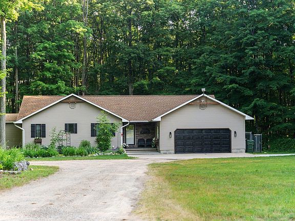 What an idyllic 5-acre setting for this impeccably remodeled home with an attached insulated/heated/AC garage with epoxy floors, a large full basement with a large shop area and other walled rooms ready to be finished, an outdoor wood boiler to supplement the home forced air furnace, new Anderson Windows May of 2023, a Generac whole house back up generator, and a concrete RV pad with 50 amp service. This wonderful single-story ranch home offers an open floorplan, perfect for relaxing in front of the slider or entertaining guests inside or on the attached 11’ x 20’ outside deck. The beautiful, custom industrial modern, farmhouse design kitchen offers white Shaker cabinets with black hardware, granite counters, updated appliances, a huge island with a single slab of granite, that has generous storage, a large farmhouse sink with a view into the lovely yard. Beautiful LVP flooring. Enter your own spacious primary bedroom suite, complete with shiplap feature wall and slider to its own private 11'x11'+/- deck. Completing the primary suite is a beautiful large private bath area with a walk-in closet, double sink vanity, large walk in tile shower & multiple windows. Superb location near Shanty Creek ski and world-class golf resort, Lake Bellaire, Downtown Bellaire, and all the recreation northern Michigan has to offer. (Note-all dog kennels/fencing in the garage and outside the garage are not included with the sale).