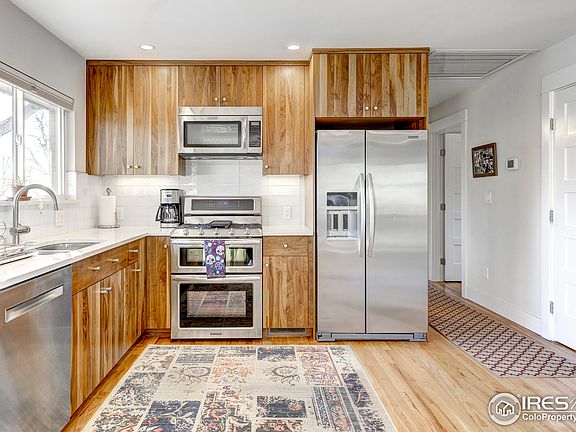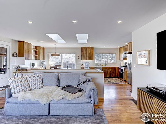 High-end finishes adorn this completely remodeled residence designed by Melton Design Build. A spacious, fully fenced-in and pet welcoming yard surrounds the exterior wrapped in picturesque landscaping. Enter into the open main-floor layout drenched in generous natural light from large windows. Oak hardwood flooring extends gracefully underfoot, from a living area centered by a tiled fireplace to a stunning kitchen boasting a duel-fuel range, and stainless steel appliances. Built-in custom walnut cabinetry provides ample storage in a dining area illuminated by vast skylights. An 8' sliding glass door promotes outdoor connectivity to a deck in a private, fenced-in backyard. Relax and refresh in a primary suite complemented by a walk-in closet and a spa-like bath w/ a walk-in steam shower and soaking tub. A second main-floor bedroom affords space for a home office. Downstairs, a finished basement presents a rec room, two bedrooms, a large storage room, and a convenient laundry area. This home with remarkable pride of ownership is nestled within Green Meadows, a coveted Boulder location offers proximity to Columbine Park and Pearl Street Mall.