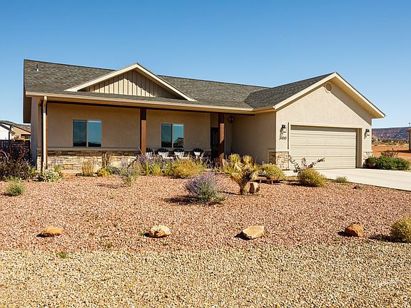 3100 E Ryker Ct. Crimson Estates: This like new 2024 immaculately kept home features 3 bed / 2 baths plus a new office addition! Spacious open floor plan perfect for entertaining. Upgrades include LVP Flooring throughout the main living areas and Granite Countertops in the kitchen, baths & laundry. Granite sills in kitchen & guest bath. Large sliding doors invite you to the outdoor covered patio with incredible views of the Vermillion Cliffs! Above ground swimming pool is perfect for a dip on warm summer days. Super cute Shed/Pool House included! Partially landscaped with local vegetation and garden tubs are included for those with green thumbs! Lots of shelving in the garage for extra storage!