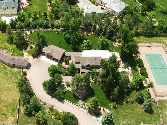 This enchanting country 2-Story custom home is poised at the top of a hill surrounded by tall pines & mature trees to take advantage of the beautiful panoramic Mountain views, even from the tennis court. Exquisitely designed, this S.W. style home is both gracious & fun, featuring gleaming hardwood floors, tile & carpet, custom carved pillars & fireplace mantle, divine gourmet kitchen with slab granite custom countertops, sunny breakfast room & solarium, 2 family rooms, vaulted library/study, 5 bedrooms plus master suite with balcony, kid's loft. Swimming pool and barn are all just a few steps from trails & the Highline Canal Park. Immaculate move-in condition.Includes: Beautiful Custom Stained-Glass Window in Living Room, Sub-Zero Refrigerator, 2 Sets of Double Sinks, Thermador Oven, Gas Cook Top w/Heat Lamps & Vent Fan, Microwave Oven, Security System, Pool Equipment.