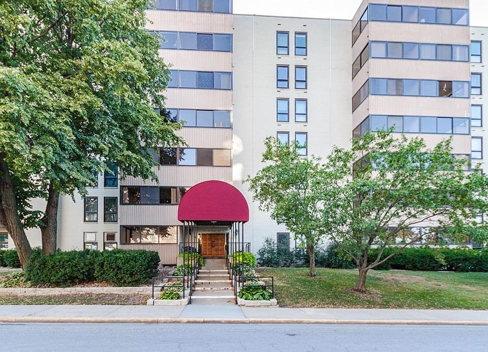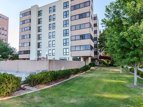 Great views from this 5th floor corner unit! Very desirable South of Grand location. Well kept condo with updated granite in kitchen, Lots of natural light. 3 entrances to enclosed balcony with spectacular views of the City. The kitchen opens to the living room. It boasts a wood burning fireplace that is currently has a electric insert. The master suite offers zoned heating/cooling, two closets and private bathroom. Nice sized spare bedroom and additional hall bath. Lots of in unit storage. HOA dues include heat, a/c, water, trash, internet, cable tv, secure building, on site management and maintenance staff. Amenties include indoor pool, spa, sauna, party room, Guest room available for rent, 2 elevators, extra storage area on ground level. Heated underground parking available for $45 per month. Beautiful outdoor area to gather with friends!